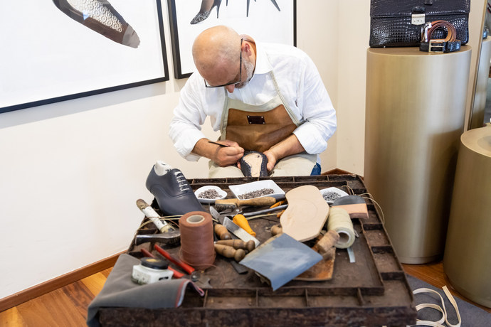 Il mastro calzolaio all’opera durante la live performance nella boutique di Fragiacomo | ph. Fragiacomo Press Office