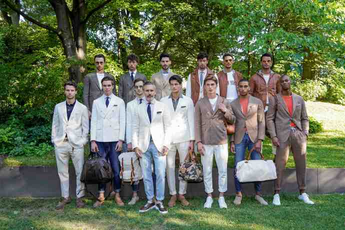 I modelli Eleventy indossano la collezione SS 2020 insieme al fondatore e direttore creativo uomo Marco Baldassari | ph. Eleventy Press Office