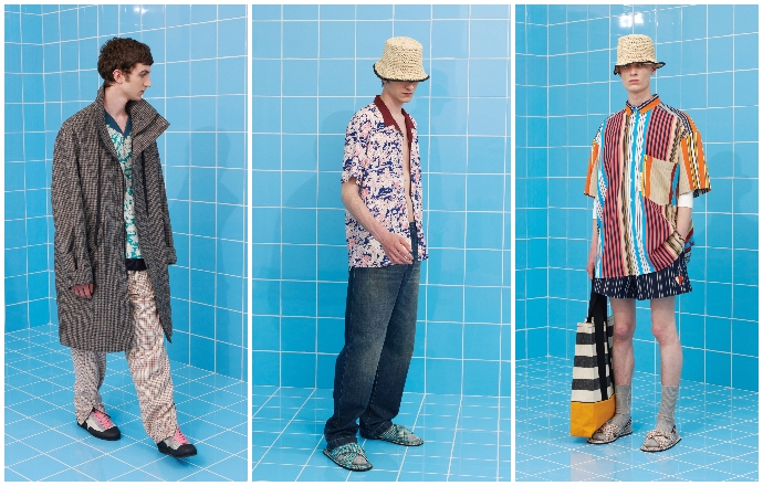 La seta stampata delle camicie hawaiiane ricorda cartoline di paesi lontani e si alterna a polo dalle righe maxi effetto rugby con colletti realizzati a mano; ancora camicie ampie a maniche corte rivelano un gusto esotico attraverso le stampe indiane che si alternano alle righe patchwork. I completi informali si contaminano con il workwear combinando giacche monopetto oversize, camicie zippate e pantaloni ampi.