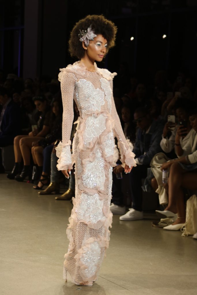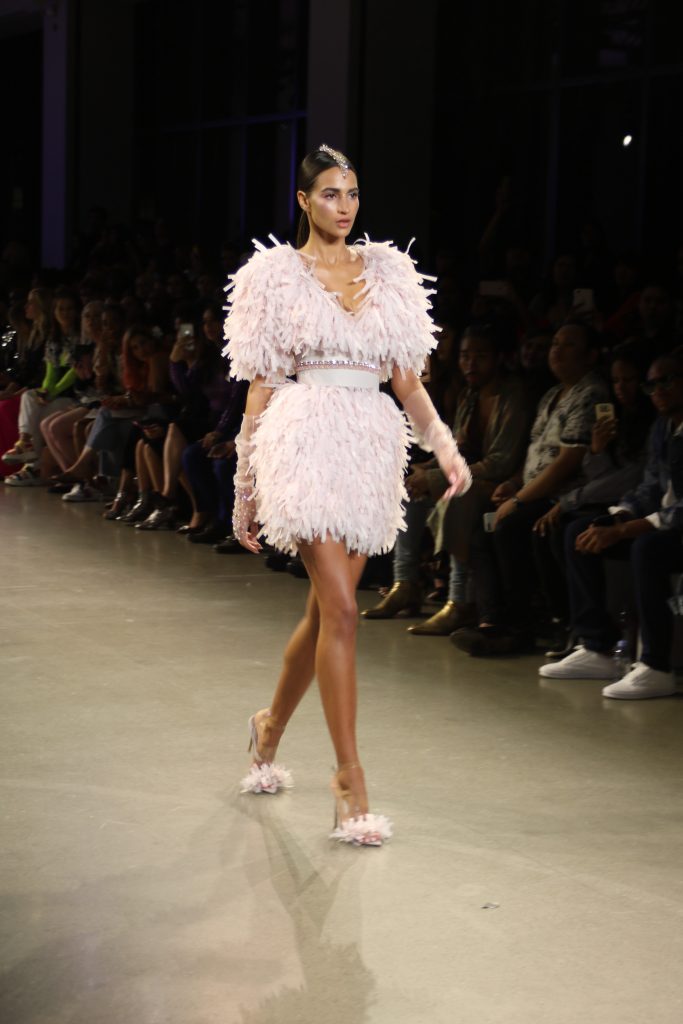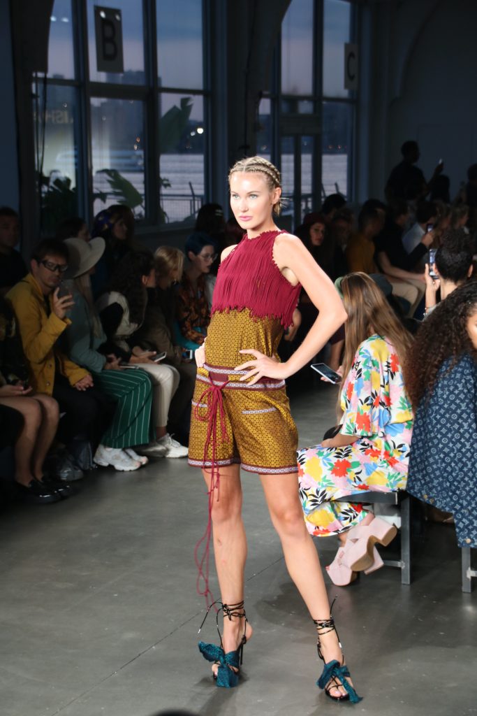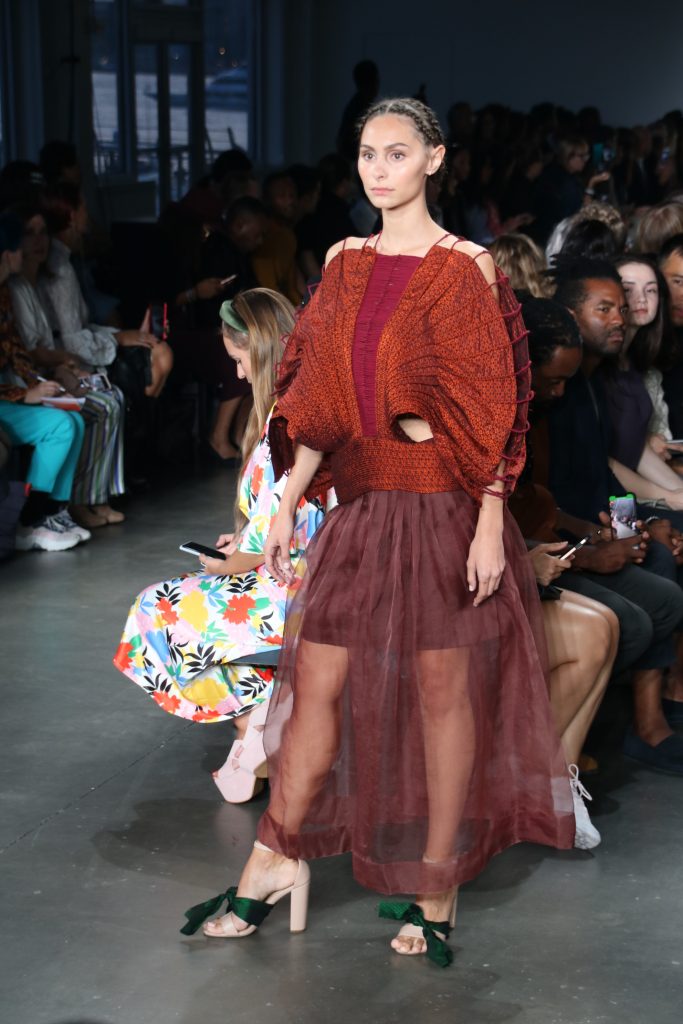 Anche gli accessori come i copricapi, gli orecchini, i guanti di tulle ricamati e i tacchi delle scarpe decorati di piume hanno contribuito a portare sulla passerella della New York Fashion Week un po’ del profumo del paese natio del designer.