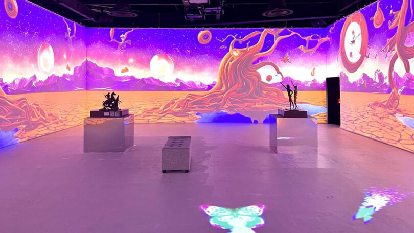 Ma il “pezzo forte” è senza dubbio la Surreal Painting Room, una stanza completamente bianca, arredata con due sedute e quattro sculture. Lo spazio ospita delle esperienze in realtà virtuale della durata di 15 minuti e – come ha spiegato Santiago Buitriago – permette di entrare nell’arte di Salvador Dalì. Un deserto con il celebre orologio del maestro, un mondo lunare con misteriose montagne viola e un mare profondo – dove vivono creature fantastiche – avvolgono lo spettatore e lo trasportano in una realtà altra, dove il tempo e lo spazio hanno un significato diverso da quello conosciuto.